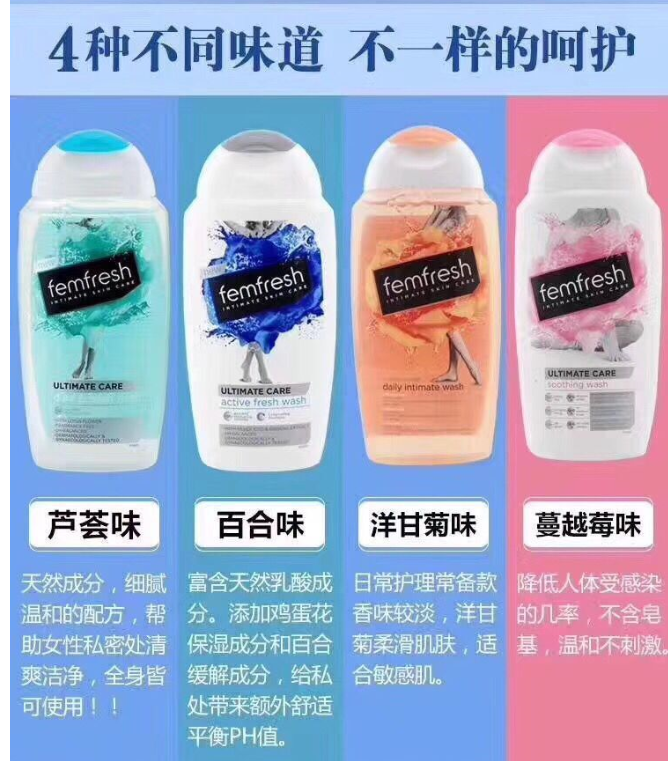* Femfresh 是英国唯一经皮肤科、妇女科测试的私密洗护液。 * 被來自世界各地的上百完女性们所信赖及青睐。 * 独特的无皂温和PH平衡天然成分。 * 带给你拥有超过70年研发经验的专家团队。 * 99%的女性经第一次使用femfresh后都会选择推荐给其好友。 * 英国妇女协会推荐产品。