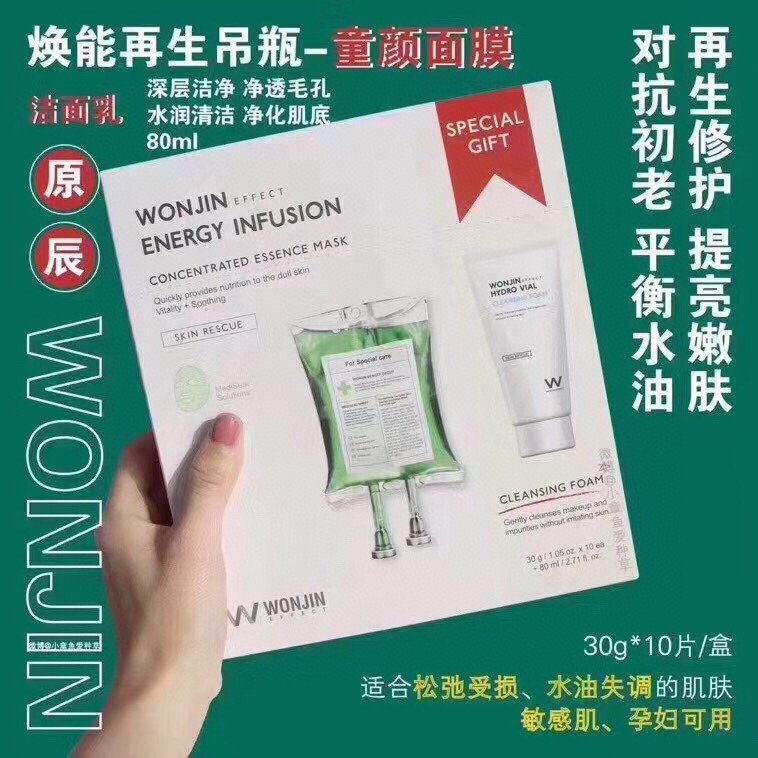 新款Wonjin原辰焕能再生吊瓶面膜,强效补水修护,唤醒肌肤补充活力含6种胜肽,17种氨基酸,脂质体维生素A.B.C.E,3种海洋物质,6种透明质酸面膜纸采用纤薄医院灭菌材质。