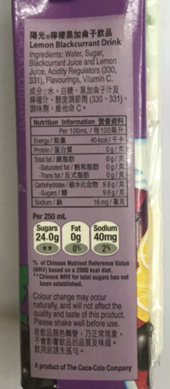 有卫检:阳光柠檬黑加仑子饮品250ml
