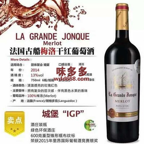 有卫检:F-法国古船梅洛干红葡萄酒750ml(13%VOL)