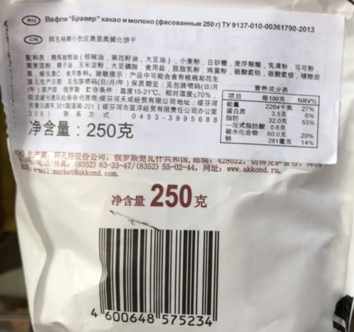 有卫检:俄罗斯阿孔特牌慕利莫威化饼干202G