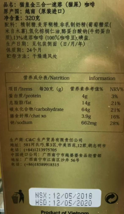 有卫检:猫皇金三合一速溶猫屎咖啡(20G*16条)