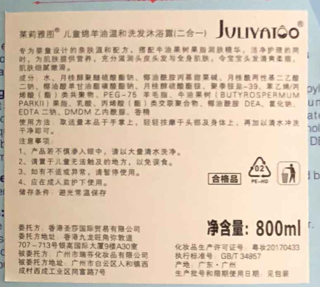 有卫检:茱莉雅图儿童洗沐二合一800G(绵羊油蓝)