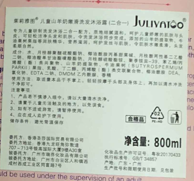 有卫检:茱莉雅图洗发沐浴二合一(山羊奶/粉)800G