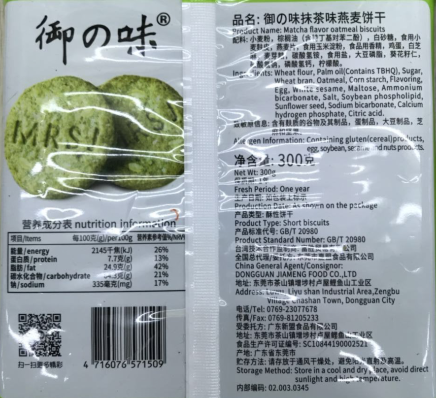 S有卫检:御之味抹茶味燕麦饼干300G国产