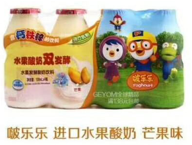 HS有卫检:啵乐乐水果酸奶(芒果味)100ML国内产