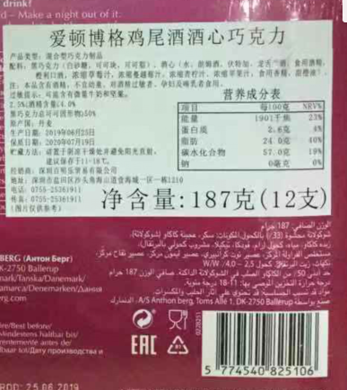 有卫检:爱顿博格鸡尾酒酒心巧克力187克(12支)
