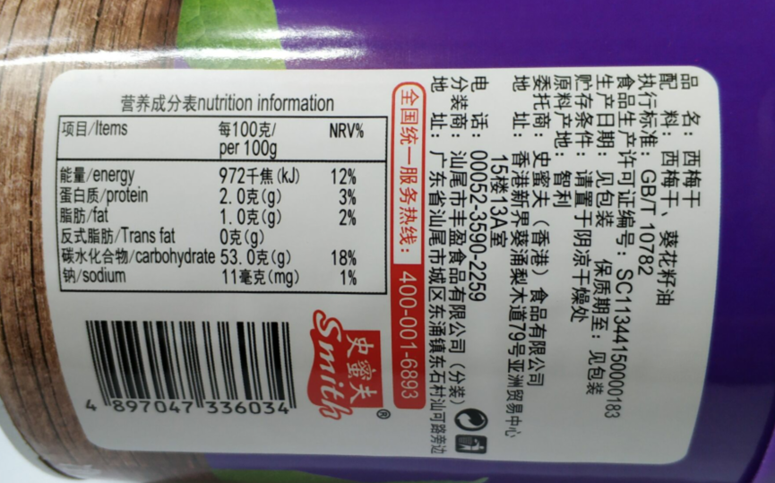 有卫检:史蜜夫西梅干500G国内分装