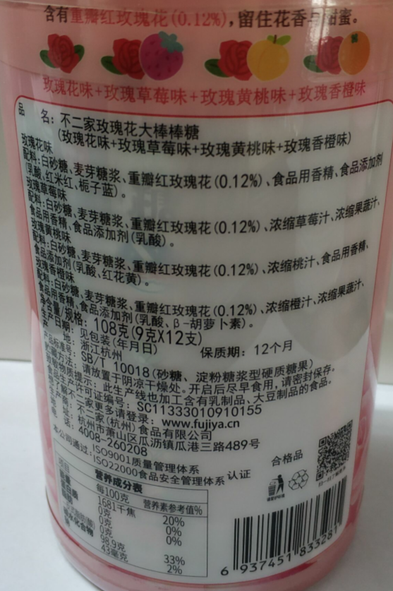 有卫检:不二家玫瑰花大棒棒糖(玫瑰花味+草莓味+黄桃味+香橙味)108G(9G*12支)