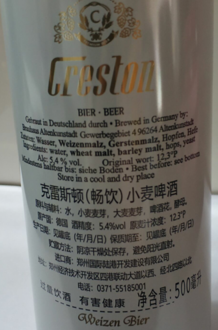 有卫检:克雷斯顿(畅饮)小麦啤酒500ML酒精度5.4%