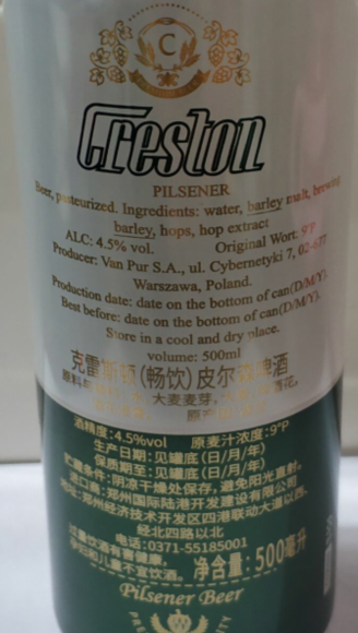 有卫检:克雷斯顿(畅饮)皮尔森啤酒500ML酒精度4.5%