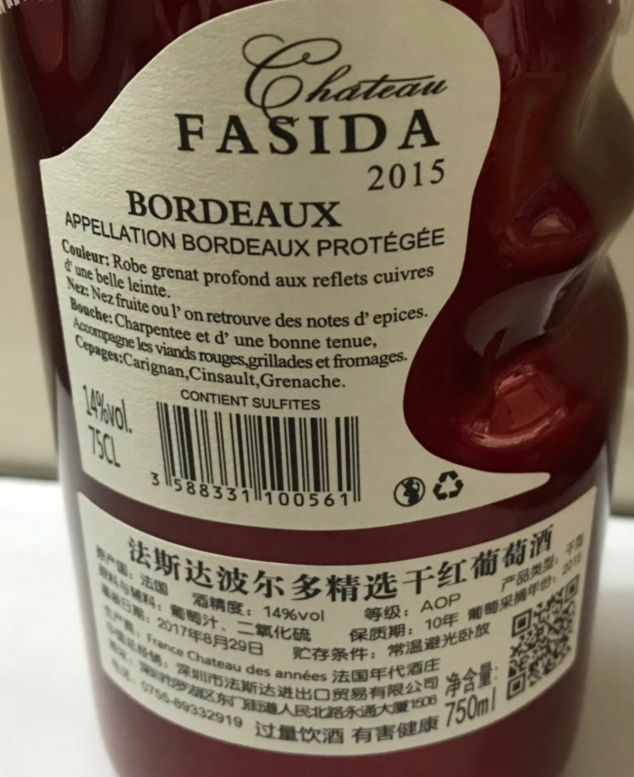HF有卫检:法斯达波尔多精选干红葡萄酒750ML(酒精度14%)红