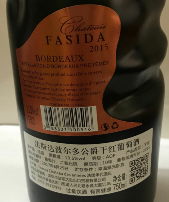 HF有卫检:法斯达波尔多公爵干红葡萄酒750ML(酒精度14%)黑