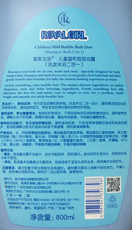 J皇家女孩儿童二合一(温和泡泡)蓝800ML委托国内产