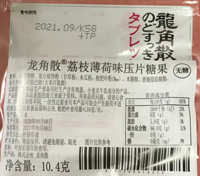 有卫检:龙角散荔枝薄荷味压片糖果10.4G(无糖)