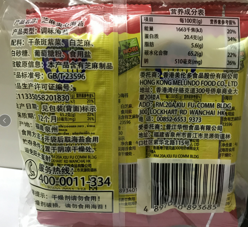 YX有卫检:彩伦芝麻夹心海苔40G(4*10包)国代加工(可半件出)