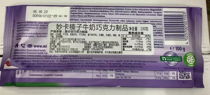 有卫检:妙卡榛仁夹心牛奶巧克力100G