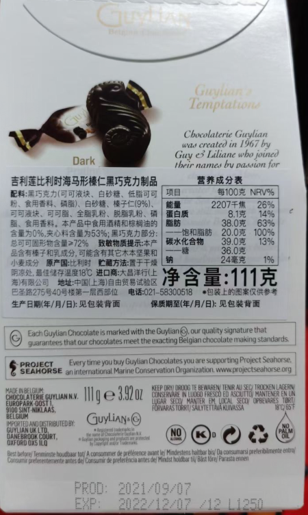 有卫检:吉利莲比利时海马形榛子黑巧克力111G