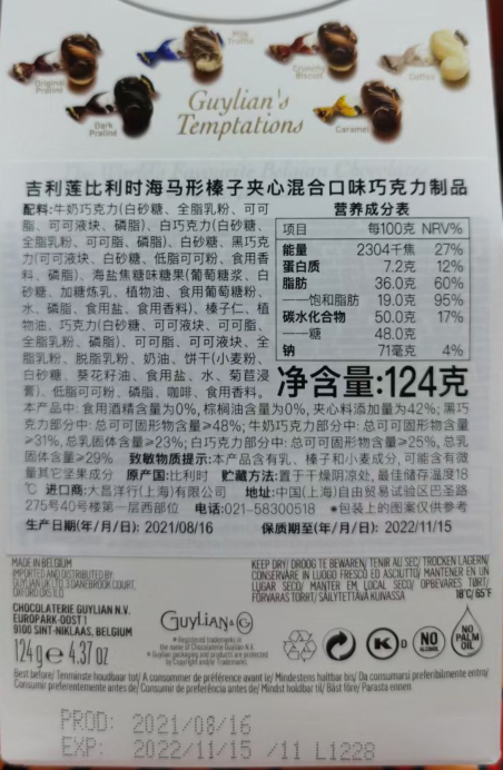 有卫检:吉利莲比利时海马形榛子夹心混盒口味巧克力124G
