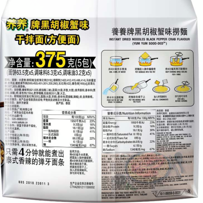 有卫检:养养牌黑胡椒蟹味干拌面5连包375G(5包*75g)