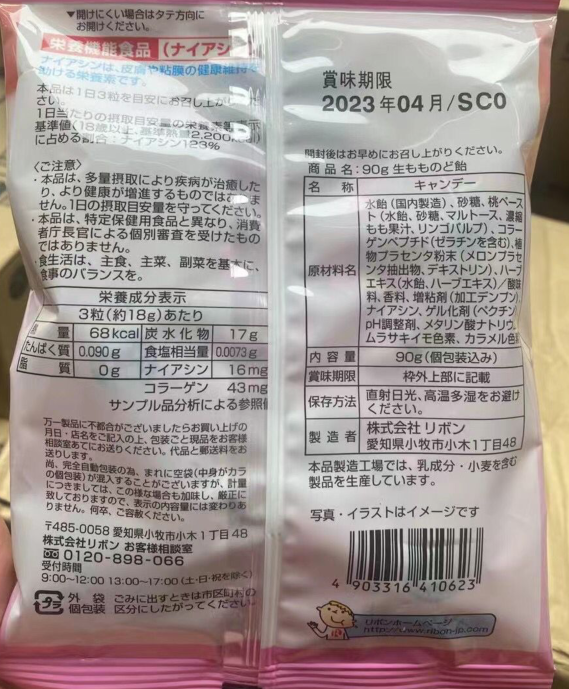 日本理本鲜桃味胶原蛋白肽夹心糖果90G