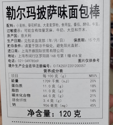 有卫检:意大利勒尔玛面包棒120克(披萨味)