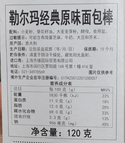 有卫检:意大利勒尔玛面包棒120克(经典原味)