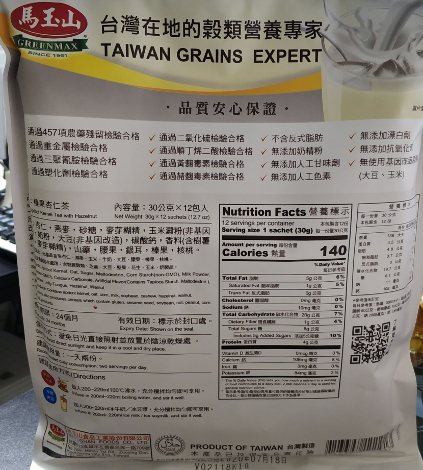 有卫检:马玉山榛果杏仁茶360g